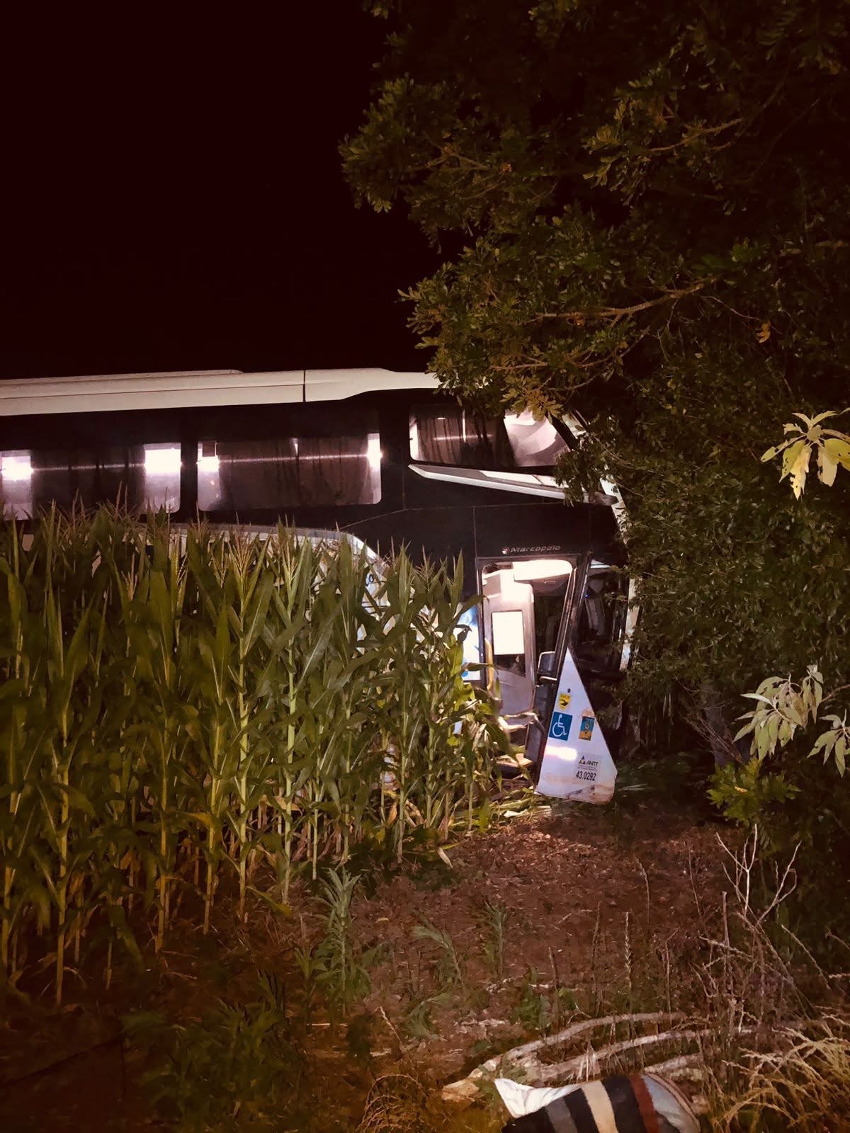 O ônibus acabou saindo da pista e somente parou em uma área de lavoura de milho. Apesar do susto, nenhum passageiro sofreu ferimentos.