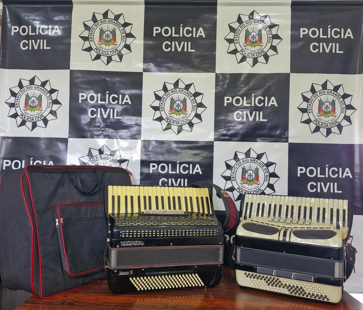 A Polícia Civil, por intermédio da Delegacia de Roque Gonzales, com apoio da equipe de investigação da Delegacia de Polícia de São Luiz Gonzaga, recuperou duas gaitas provenientes de estelionato praticado por meios eletrônicos. As vítimas haviam anunciado a venda dos instrumentos musicais nas redes sociais, ocasião em que o autor do delito contratou taxistas para retirar os objetos e encaminhou comprovantes falsos de transferência via PIX, sem que o pagamento fosse efetivamente realizado.
