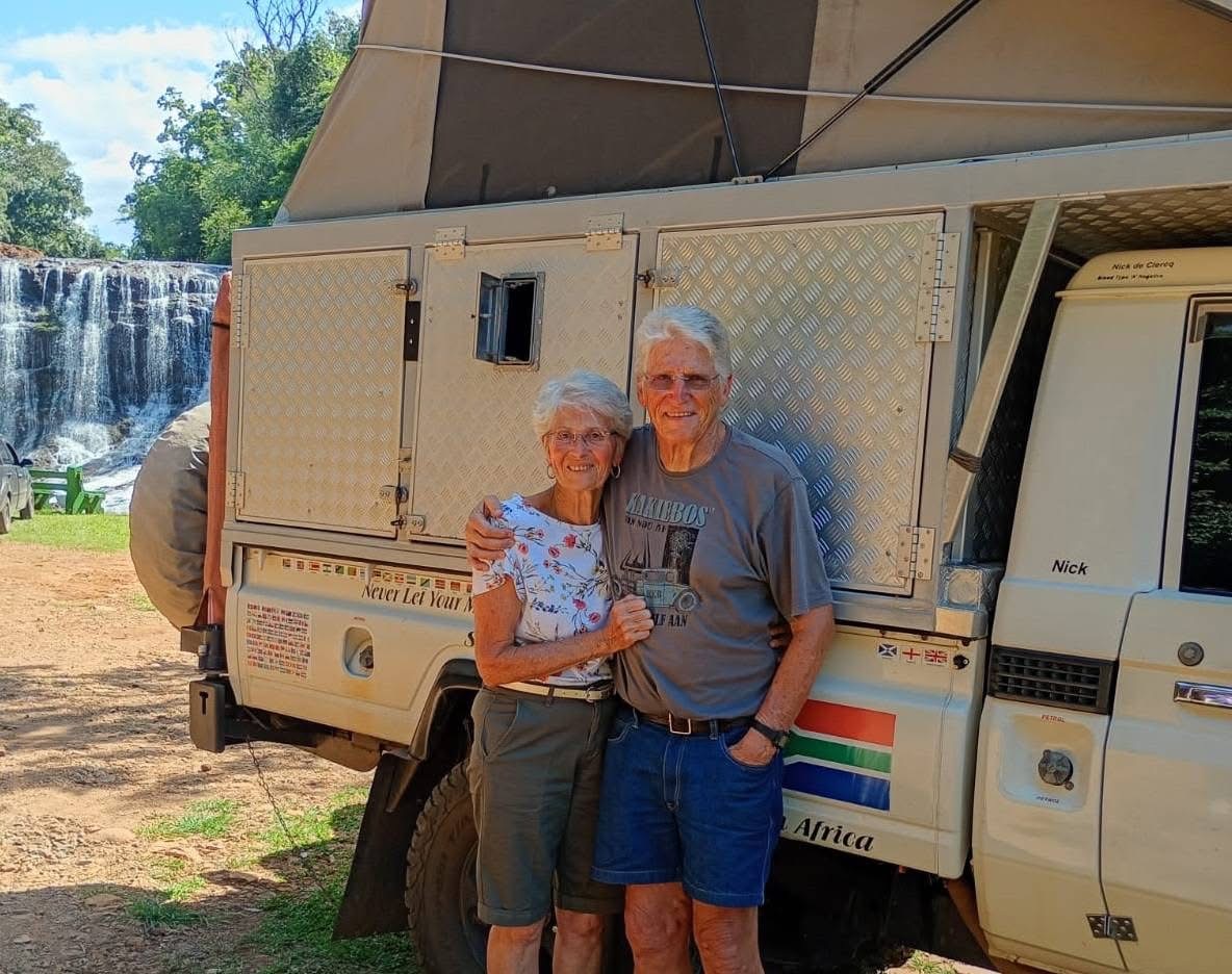 Naturais da África do Sul, os dois decidiram viajar após a perda do filho, que morreu aos 25 anos. A mudança de rotina foi uma forma de enfrentar o luto e seguir em frente. Aposentados, ele engenheiro mecânico e ela secretária, adaptaram o próprio carro para longas viagens, onde dormem e se deslocam.