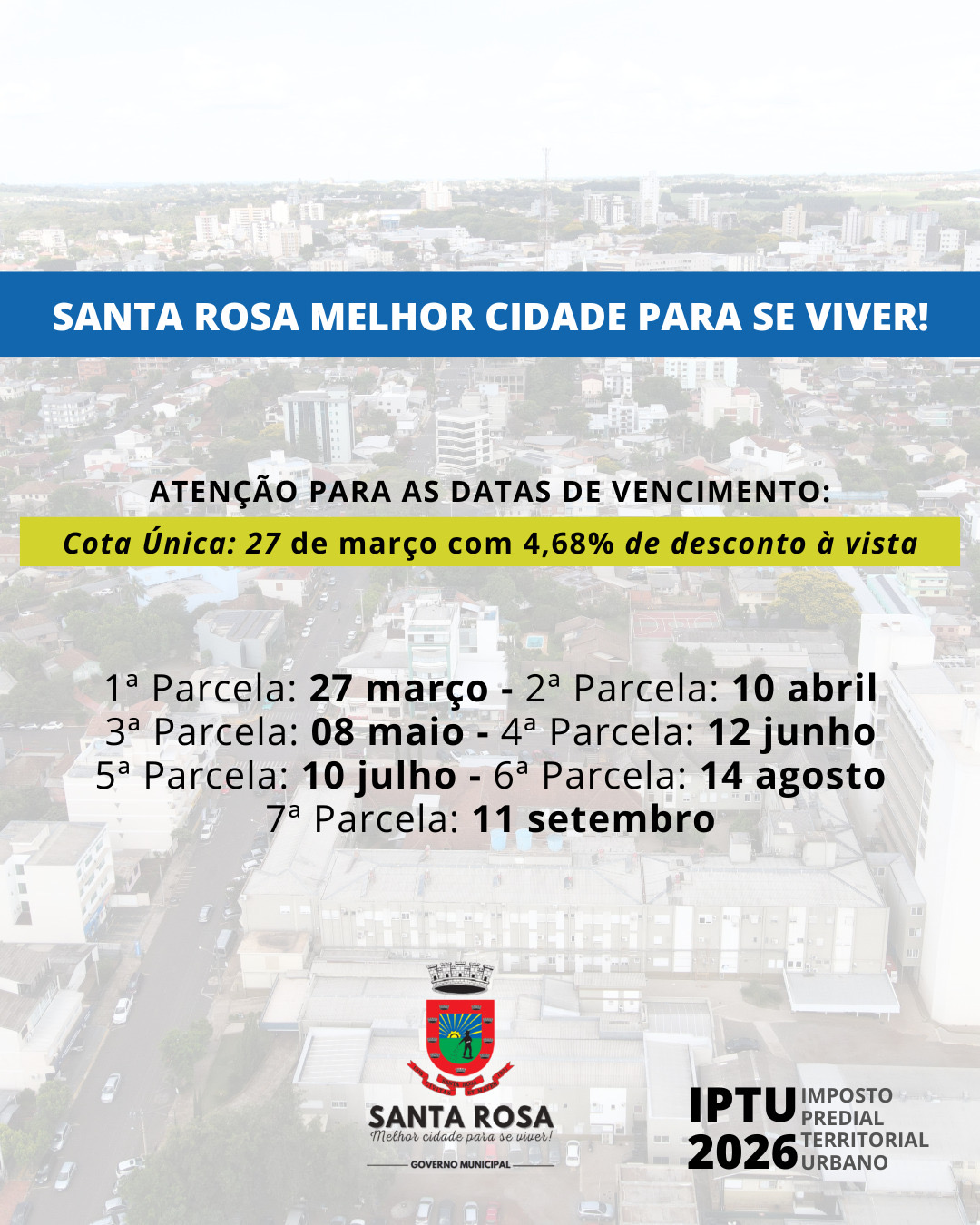 A Prefeitura de Santa Rosa divulgou as datas de vencimento do IPTU 2026. Quem optar pelo pagamento em cota única até 27 de março terá 4,68% de desconto à vista.