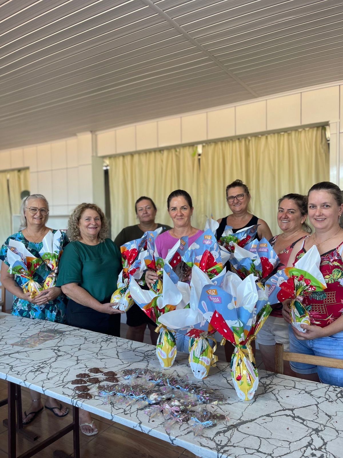 Além da atuação do Clube de Mães da sede, outros grupos de mulheres do interior também participam de ações voltadas à produção de alimentos típicos da Páscoa. Ao longo de uma rodada de encontros, a extensionista rural da Emater/RS-Ascar Jacinta Raach Henckes orientou as participantes sobre a confecção de ovos caseiros de chocolate.